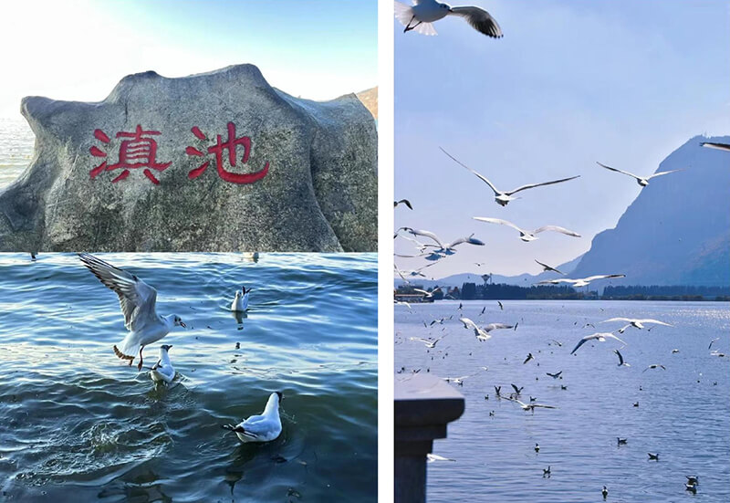 11月4日中午,旅行團乘機順利抵達(dá)四季如春的昆明,乘車前往滇池大壩。每年11月至來年3月滇池海埂公園總會聚集成千上萬只來此過冬的紅嘴鷗,在湖面上翻飛的紅嘴鷗成為滇池冬季的一大景觀。