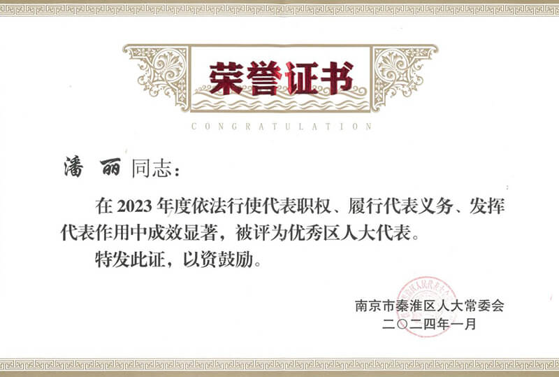 潘麗女士當選區(qū)人大代表以來,始終堅持"人民選我當代表,我當代表為人民"的信念,作為一名民營企業(yè)家,始終堅持"為社會創(chuàng)造價值,為客戶提供服務(wù),為員工謀求福祉"的企業(yè)價值觀,以高度的責任感和敬業(yè)精神,勇于挑戰(zhàn),開拓創(chuàng)新。在本屆會議上再次被評為“優(yōu)秀區(qū)人大代表”。